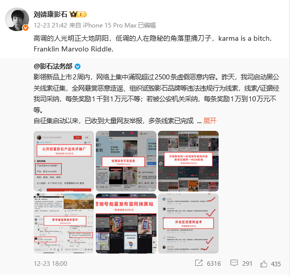 12月22日,影石创新表示,其首款全景无人机影翎 Antigravity A1上市两周内,网络上涌现了超过2500条虚假恶意内容,包括伪造消费者差评诋毁产品质量、造谣销量遇冷等内容。对此,影石法务部发起全网悬赏,公开征集“黑公关”相关线索,若线索被公安机关采纳,奖励1万元至10万元不等。