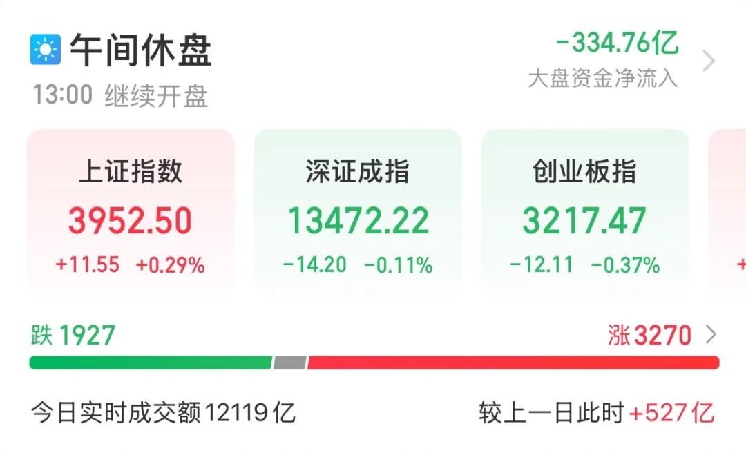 12月25日早盘,A股三大指数震荡分化,沪指持续上攻。截至午间收盘,上证指数报3952.50点,涨0.29%;深证成指、创业板指分别跌0.11%、0.37%。沪深北三市半日成交12119亿元,较上个交易日同期放量527亿元。