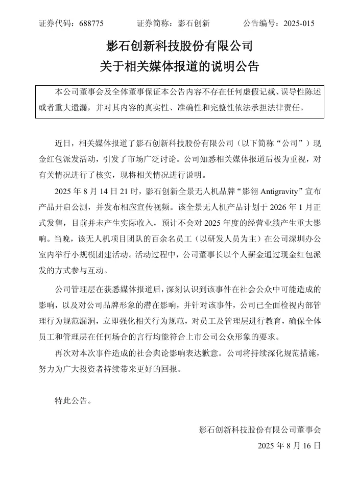 IT之家从此前官方公告获悉,2025 年 8 月 14 日 21 时,影石创新全景无人机品牌“影翎 Antigravity”宣布产品开启公测,并发布相应宣传视频。当晚,该无人机项目团队的百余名员工(以研发人员为主)在公司深圳办公室内举行小规模团建活动。活动过程中,公司董事长以个人薪金通过现金红包派发的方式参与互动。