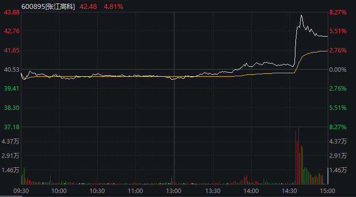 A股市场上,今日午后,张江高科盘中直线拉升,一度涨超8%,截至收盘,涨幅仍近5%。