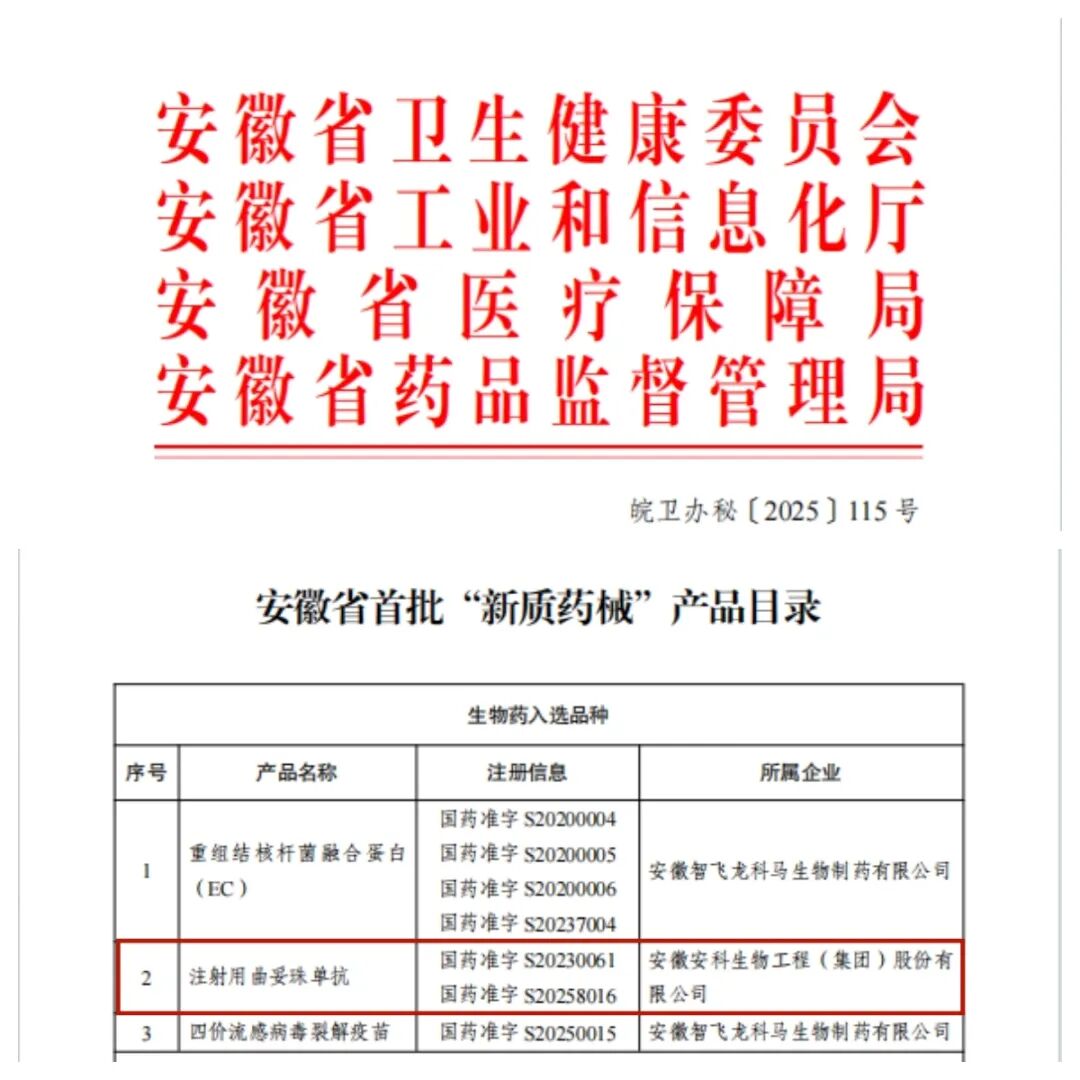近日,安徽省卫生健康委员会、安徽省工业和信息化厅、安徽省医疗保障局及安徽省药品监督管理局联合印发《关于发布安徽省首批“新质药械”产品目录的通知》(皖卫办秘〔2025〕115号),安徽安科生物(300009)工程(集团)股份有限公司自主研发的注射用曲妥珠单抗(商品名:安赛汀 )成功入选。在本次入选的生物药品种中,安赛汀 是唯一一个抗肿瘤单抗药物。