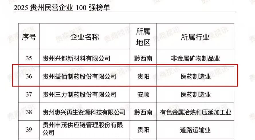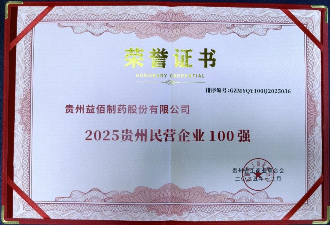 连续入围贵州民营企业百强既是荣誉,更是责任。站在新的起点,益佰制药将始终秉持“做好药,为健康”的初心使命,以科技创新为引擎,以绿色发展为底色,坚定不移走高质量发展之路,全力助推贵州健康医药产业迈向高端化、智能化、国际化。此次再度上榜,不仅印证了益佰制药在区域民营经济中的标杆地位,也折射出贵州本土医药企业穿越周期、笃行致远的战略定力与发展信心。