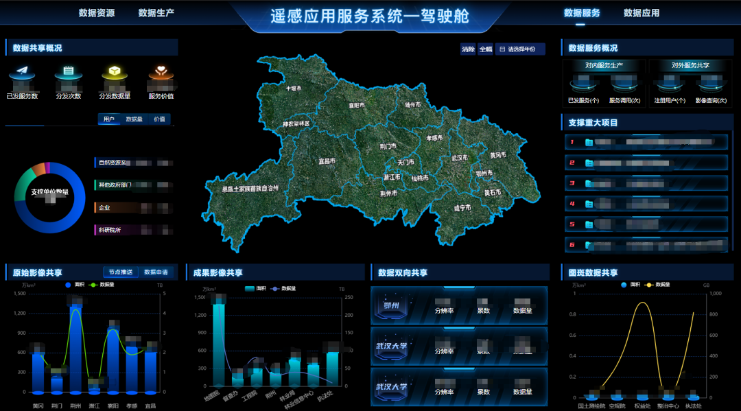 项目通过构建统一遥感应用综合服务平台及数据标准化在线服务共享机制,依托高时效、高分辨率、高频次遥感应用数据服务资源池,集成局域网、业务网、政务网、互联网的多网融合通道,为院内生产提供标准化数据服务达约1400万次,为自然资源系统、其他政府部门、企业及科研院所等单位累计提供影像产品数据约 706 TB,一站式激活卫星数据应用价值。