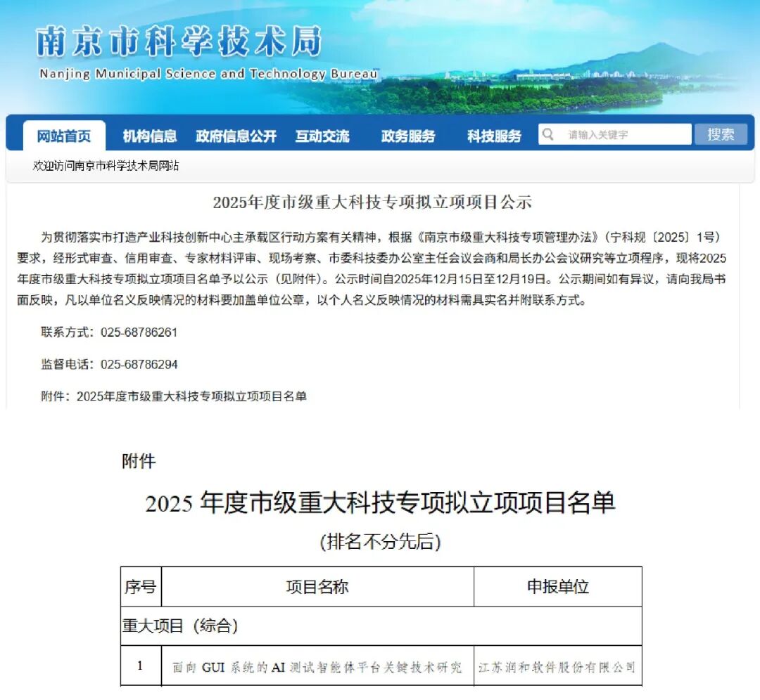 润和软件“面向GUI系统的AI测试智能体平台关键技术研究”项目入选南京市《2025年度市级重大科技专项拟立项项目名单》