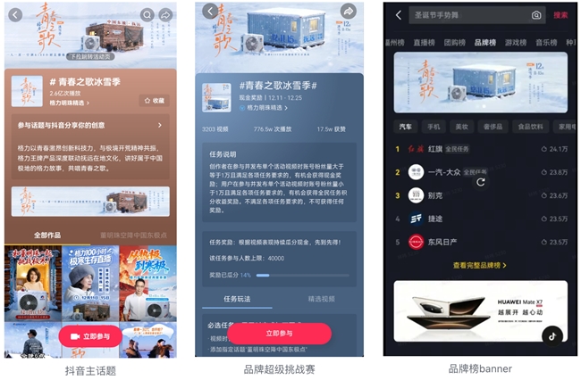 作为巨量引擎联合抖音生活服务,共同为格力量身定制的项目,“青春之歌冰雪季”从项目伊始就获得了站内全方位的资源护航。项目上线专属H5专题页,以主话题#青春之歌冰雪季#发起超级挑战赛,形成了强大的流量聚合效应。同时,品牌榜Banner以及@抖音美好家 官方账号的内容联动,共同构建了一条涵盖“曝光-互动-转化”的完整营销链路。