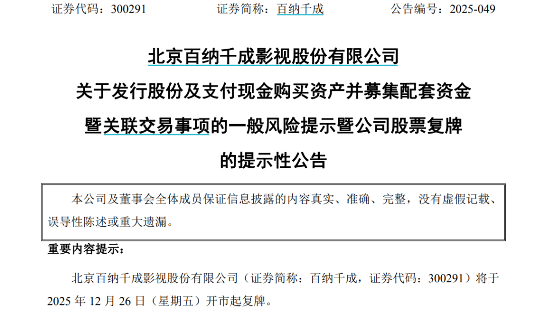 12月25日晚间,百纳千成(300291)发布公告称,拟通过发行股份及支付现金的方式直接及间接取得厦门众联世纪股份有限公司(以下简称众联世纪)100%股份,并向不超过35名特定投资者发行股份募集配套资金。公司股票将于12月26日(星期五)开市起复牌。