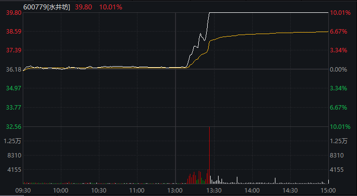 行情数据显示,12月25日午后,水井坊股价盘中直线拉升,最终封住涨停。