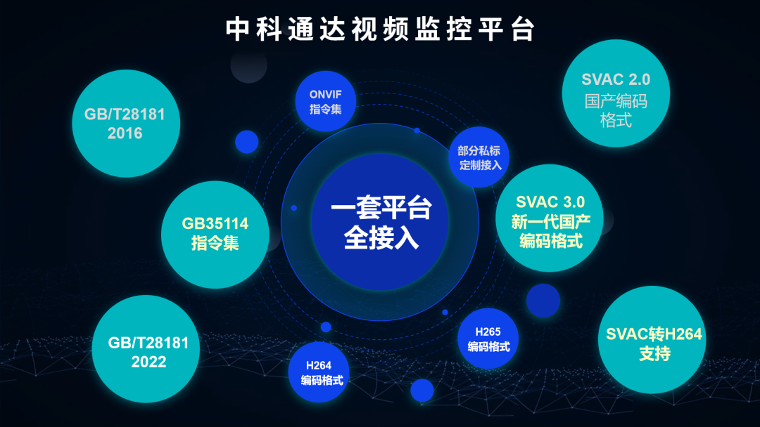 面向公共安全视频图像系统建设与治理的长期需求,中科通达视频监控平台以“全国产、自主可控”为核心设计原则,依托GB35114、GB/T28181、国密标准、信创体系等标准与生态要求,构建从标准、芯片、设备到平台的全国产适配能力,实现“可接入、可共享、可管控、可追溯”的视频资源治理与安全能力协同,形成了面向实战的端到端解决方案: