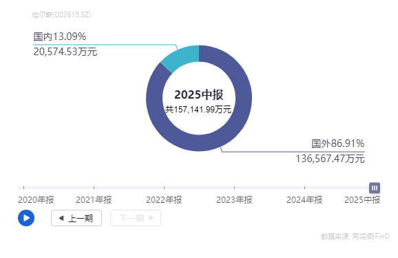 国内市场方面,哈尔斯搭建“线下+线上+新零售+私域”立体渠道网络,上线“渠道费用ROI评估模型”动态优化通路效率,线下覆盖商超、专卖店、礼品渠道等,线上深耕天猫、京东等主流平台;海外市场方面,公司OEM业务与全球知名品牌商深度绑定,同时依托泰国基地实现本土化交付,2025年上半年境外营收达13.66亿元,占总营收的86.91%,海外市场份额稳步提升。