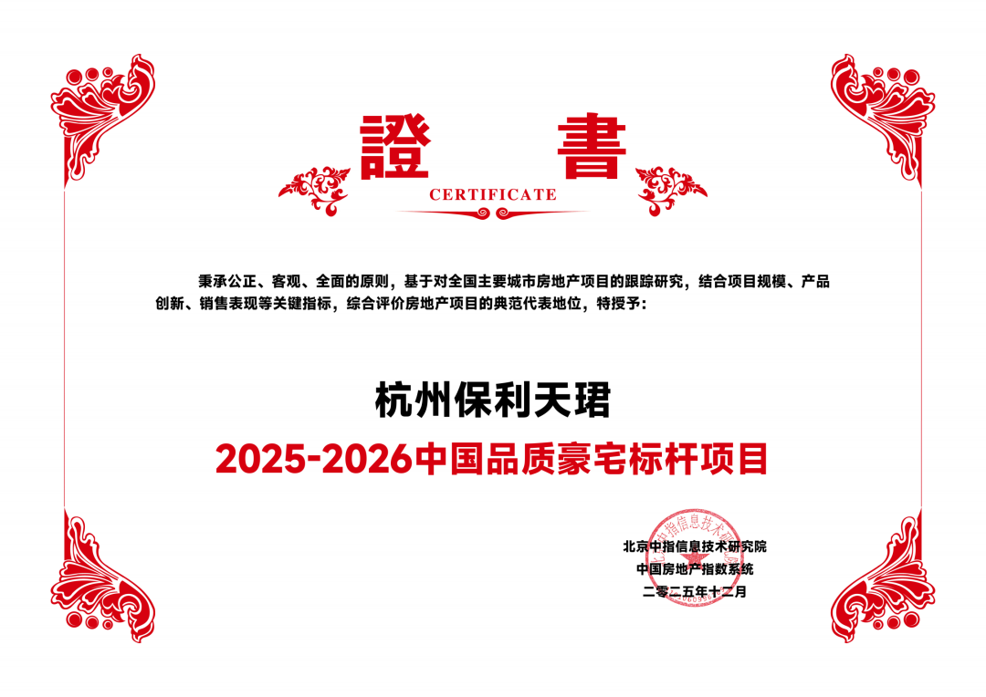 2025年12月11日,由北京中指信息技术研究院主办,中国房地产指数系统、中国物业服务指数系统承办的“2025中国房地产大数据年会暨2026中国房地产市场趋势报告会”在北京召开。大会基于大数据视角,全面总结2025年中国房地产市场形势,预判2026年走势,阐释并探讨大数据为房地产行业带来的创新驱动与巨大价值。会上,杭州保利天珺荣获“2025-2026中国品质豪宅标杆项目”。