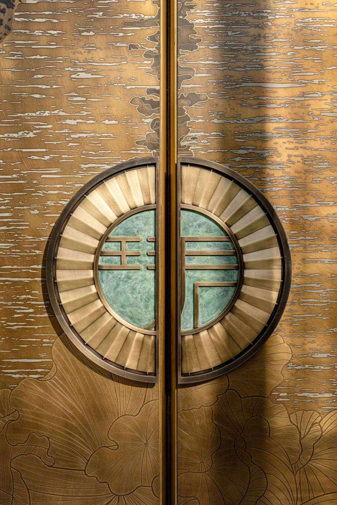 金潮启阖·文脉风骨:让门第镌刻江南千年文脉。一扇高约10米的巍峨铜门屹立,尽显庄重典雅。这扇黄铜大门名为“金潮启阖”,由铜雕大师朱炳仁的团队手工锻造,上面雕琢了钱塘江千年潮汐冲刷的印记,暗合天地开阖之象,又仿佛“楼观沧海日,门对浙江潮”的盛唐气象再现。大门旁边的六面屏风玉柱,以及顶上一柄徐徐展开的折扇图腾,也均是江南文脉的重要符号,更是门第气度的象征。