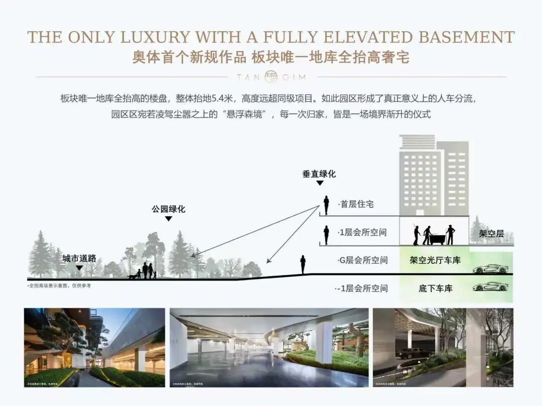 接近11米的全抬高+架空设计,赋予了1层住宅堪比4层的开阔视野,也规避了南方低楼层潮湿的硬伤。“全抬板”设计的优势还在于可以实现人行、车行、后勤(外卖、快递)三大动线的清晰划分,且将传统小区的垃圾房、配电箱等不利因素隐藏在地下空间,形成更静谧,也更私密的圈层生活场域。