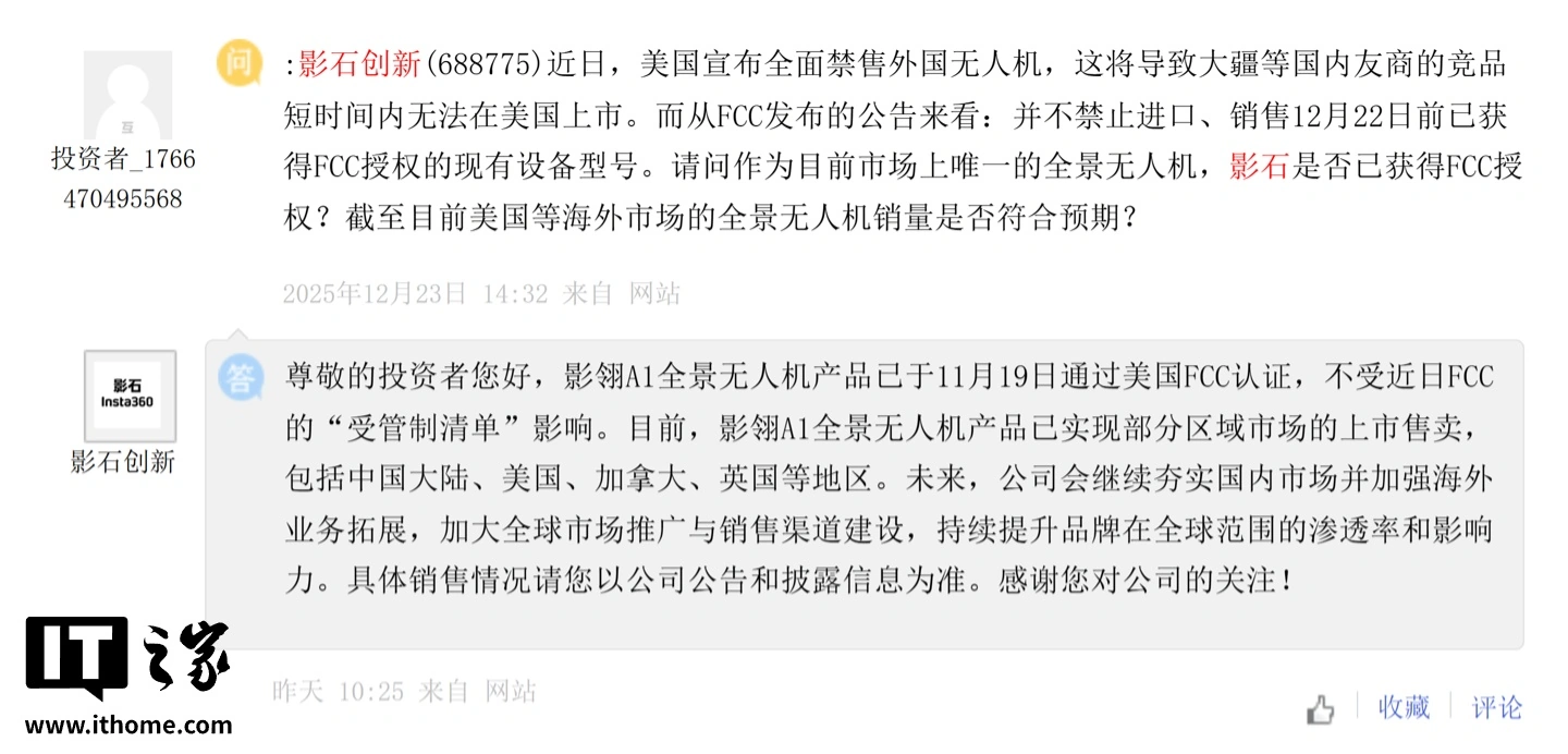 IT之家12月26日消息,影石创新本周(12月23日)在上证e互动平台发文,回应美国FCC“无人机禁令”一说。