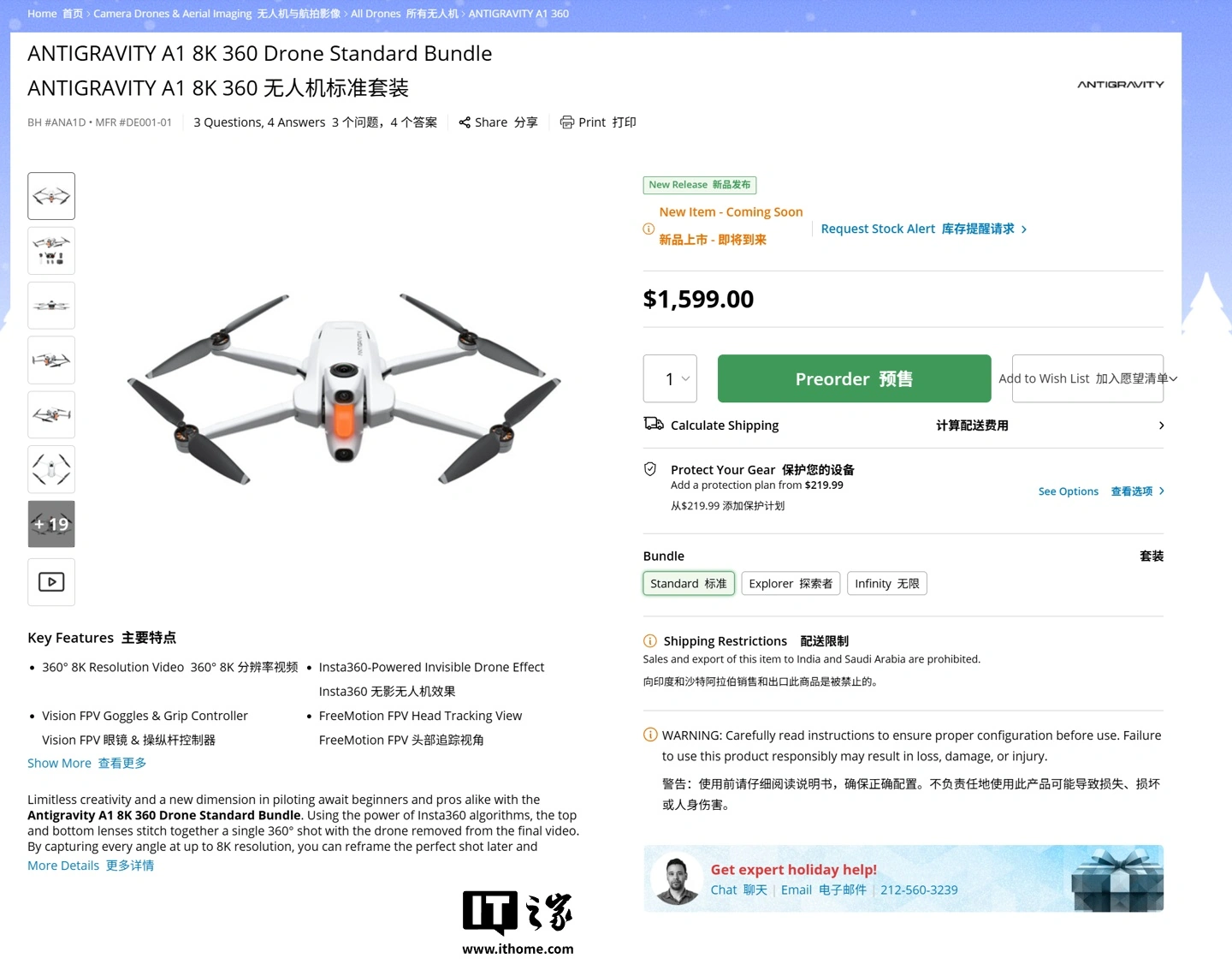 影石海外官网及B&H Photo海外电商平台显示,影翎A1目前正常在美国市场开启预售,售价1599美元(IT之家注:现汇率约合11218元人民币)起。