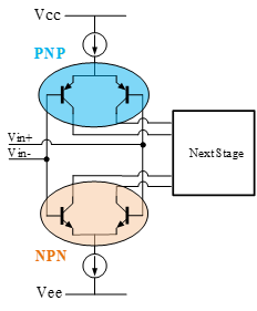 零交越失真Zero-Crossover TPA277x系列采用内部电荷泵架构:如下左图所示,相比于传统RRIO技术输入对管采用互补差分双对管结构,当输入接近正电源轨时N对管工作, 当输入接近负电源轨时P对管工作。但是当输入信号在两组对管的切换区域时,因对管的特性差异,导致输入失调电压会发生非线性跳变,产生失真。