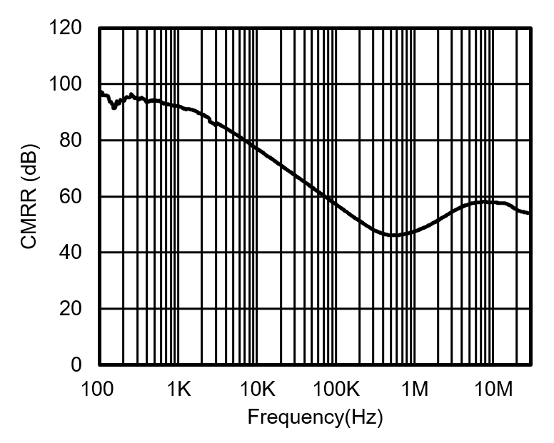 TPA277x系列具有高共模抑制比CMRR能力,如下图所示,能在高频100KHz干扰下抑制比达到了60dB,针对工业自动化、光伏逆变、储能、电机驱动、服务器电源等客户,在输入信号因上述电源拓扑的开关频率的串扰之外,还会因PCB Layout长走线寄生电感同样引入共模干扰严重场景有较强抑制能力,节省了客户在输入共模信号跳变干扰抑制上滤波的设计成本。
