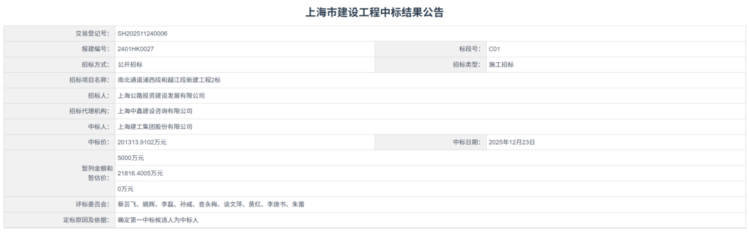 2、南北通道浦西段和越江段新建工程2标【中标额20.1亿】