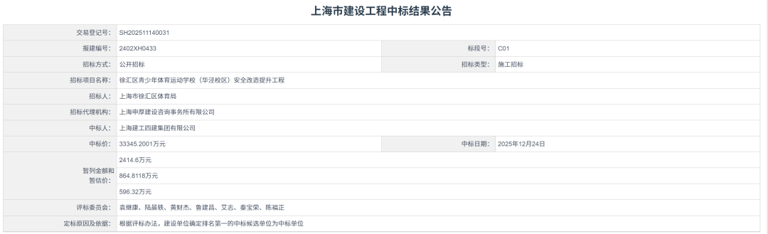 7、徐汇区青少年体育运动学校(华泾校区)安全改造提升工程【中标额3.3亿】