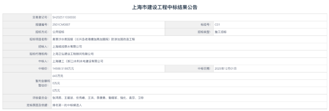 9、青草沙水库围堤(长兴岛老海塘加高加固段)防渗加固改造工程【中标额1.5亿】