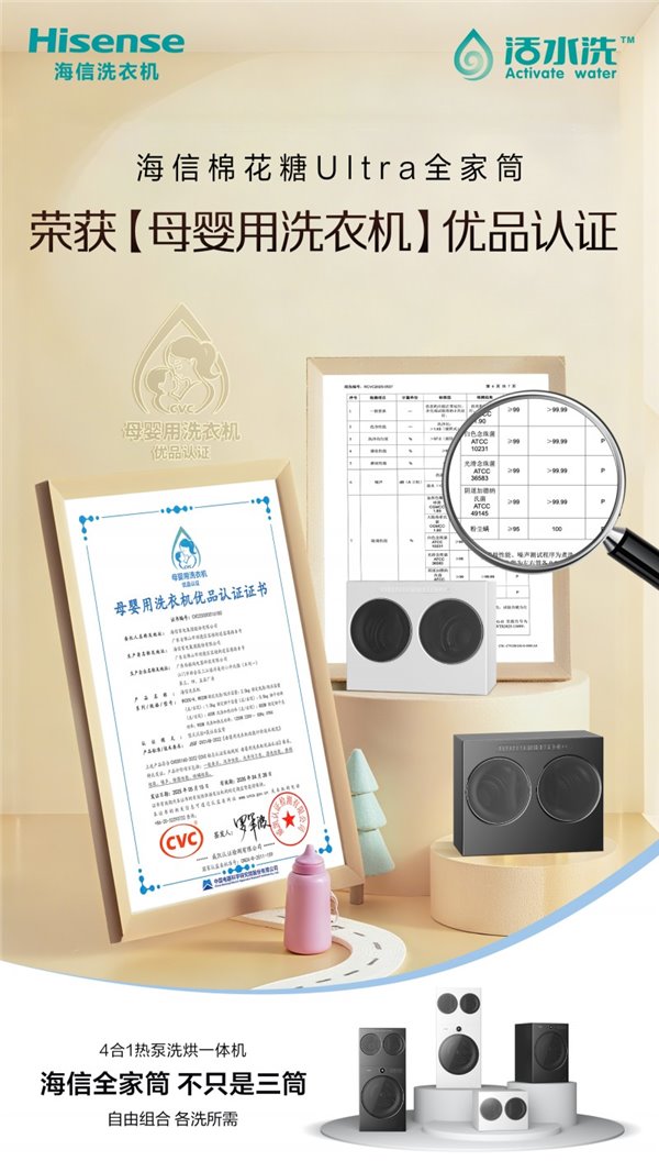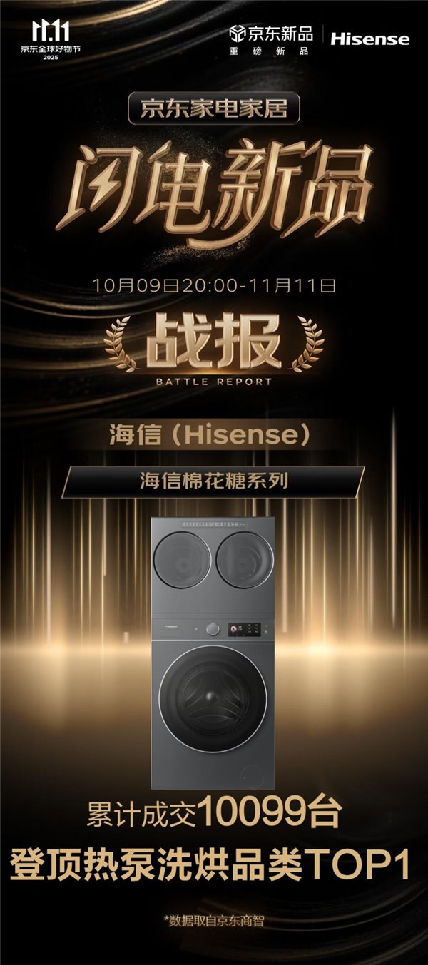 从连续两载荣膺国际 CMF 大奖,到海信洗衣机荣获欧洲权威测评机构 WHICH 认证,入选英国“BEST BUY”榜单以及拿下德国 IFA 最佳设计奖,海信洗衣机始终在不断突破。2024 年,海信洗衣机全球出货量突破 636.2 万台,成为全球 TOP10 中增长最快的品牌。今年,仅前三季度,海信洗衣机国内主营业务收入同比增长 30% 以上,增速领先行业。6 月份,其在英国市场洗烘品类占有率登顶榜首,并在克罗地亚、塞尔维亚、罗马尼亚等多国份额稳超 30%,稳居当地前三。其明星产品海信热泵洗烘一体机棉花糖 E8Q 表现同样亮眼,2025 年“双十一”期间,海信棉花糖系列累计成交 10099 台,登顶京东平台热泵洗烘品类 TOP1(10 月 9 日 20:00-11 月 11 日)。这一出色的市场表现,也充分印证了“烘干选热泵,热泵选海信”的用户口碑已日益深入人心。