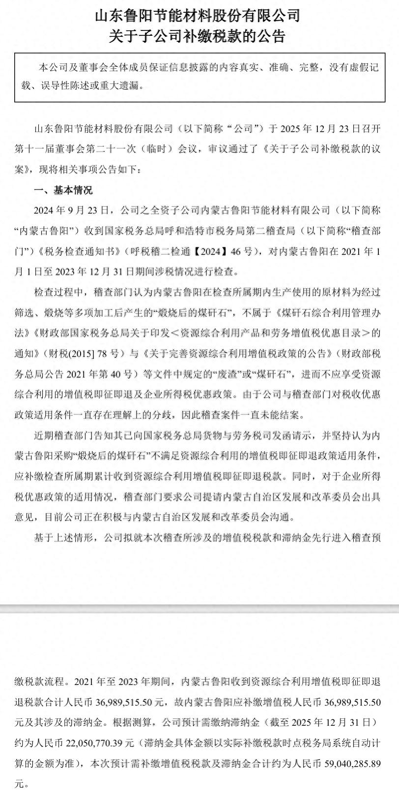 12月25日,鲁阳节能(002088)(002088.SZ)发布公告称,公司全资子公司内蒙古鲁阳节能材料有限公司(下称“内蒙古鲁阳”)因税务检查需补缴2021年至2023年期间增值税及滞纳金,合计金额约5904.03万元。