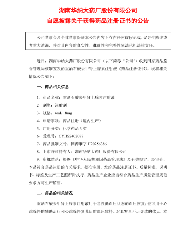 近日,华纳药厂(688799.SH)收到国家药品监督管理局核准签发的重酒石酸去甲肾上腺素注射液《药品注册证书》,该品种按新注册分类化学药品3类获得药品注册证书,视同通过一致性评价。