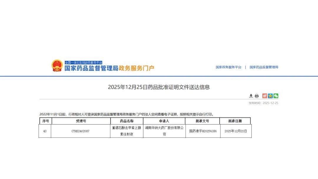 此前,原料药盐酸异丙肾上腺素和重酒石酸去甲肾上腺素已于2025年10月获得了上市批准,与制剂共同审评审批结果为“A”。