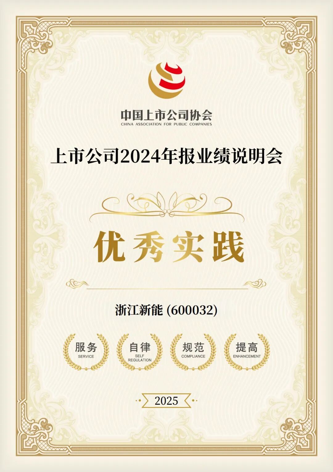 近日,中国上市公司协会发布2024“年报业绩说明会最佳及优秀实践”结果。浙江新能(600032)从5085家上市公司中脱颖而出,连续第三年荣获年报业绩说明会优秀实践。