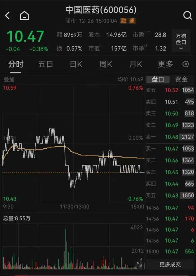 截至12月26日收盘,中国医药每股报10.47元,下降0.38%,最新市值为157亿元。