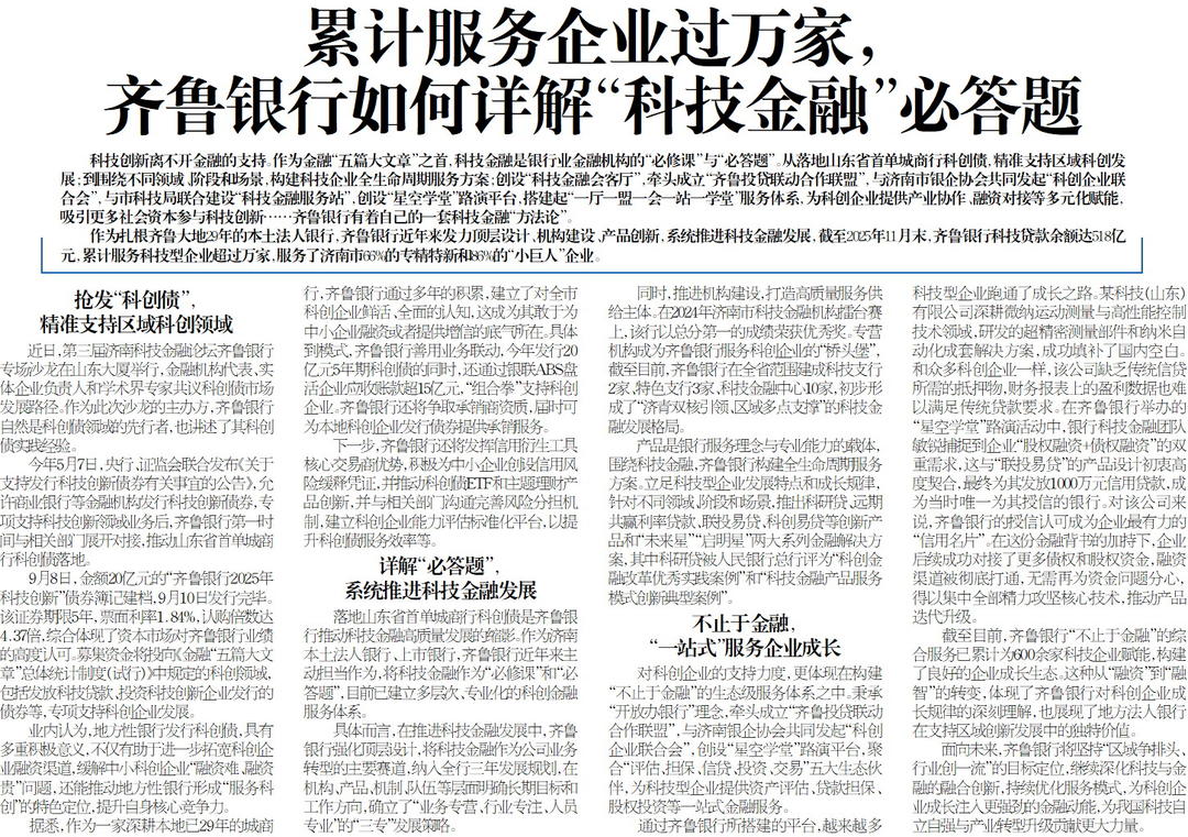 作为扎根齐鲁大地29年的本土法人银行,齐鲁银行近年来发力顶层设计、机构建设、产品创新,系统推进科技金融发展,截至2025年11月末,齐鲁银行科技贷款余额达518亿元,累计服务科技型企业超过万家,服务了济南市66%的专精特新和86%的“小巨人”企业。