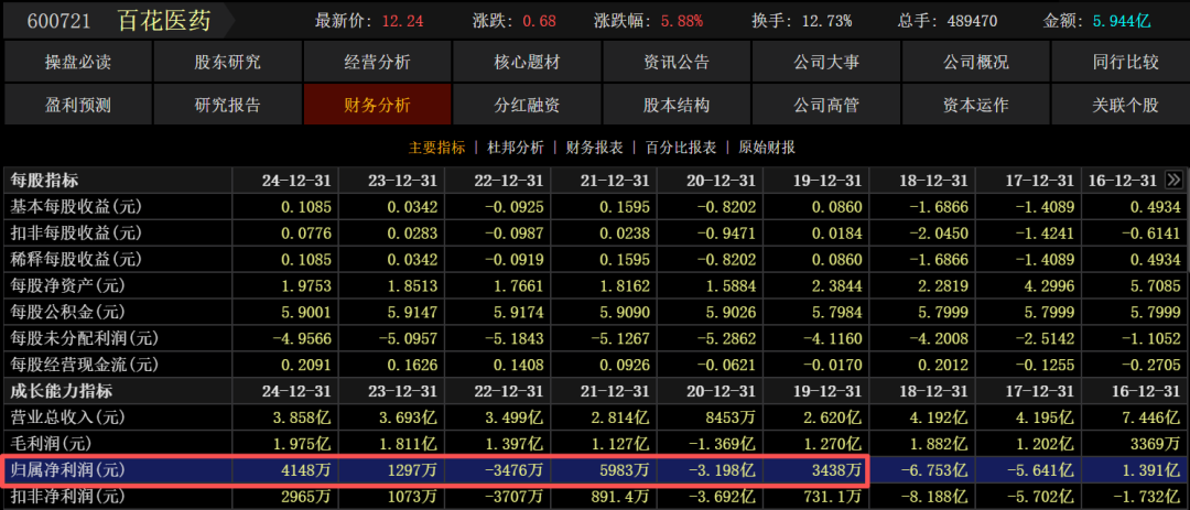 2019年至2024年,百花医药的归母净利润分别为3438.47万元、-3.20亿元、5982.71万元、-3476.47万元、1297.23万元、4147.90万元。