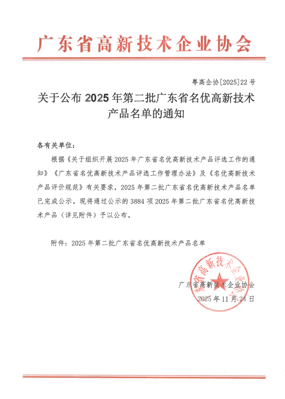 本次评选由广东省高新技术企业协会组织开展,旨在遴选一批技术先进、应用成熟、示范效应显著的高新技术产品,推动企业技术升级与品牌建设,助力广东高质量发展。