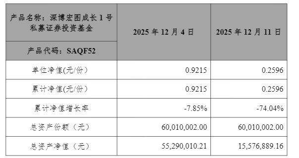 截至2025年12月25日,基金最新单位净值为0.1846,累计净值增长率为-81.54%,亏损金额约4692万元,超过公司最近一个会计年度经审计净利润的10%。公司已采取相关措施挽回损失,本次投资可能存在部分投资本金无法收回的风险。