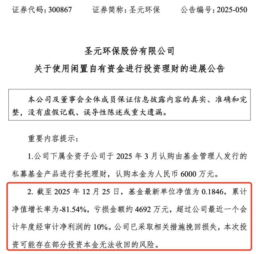 12月26日晚间,圣元环保(300867)发布公告称,公司下属全资子公司认购的私募基金产品遭遇大幅亏损,该基金累计净值大跌超81%,亏损金额约4692万元,超过公司年净利润的10%。