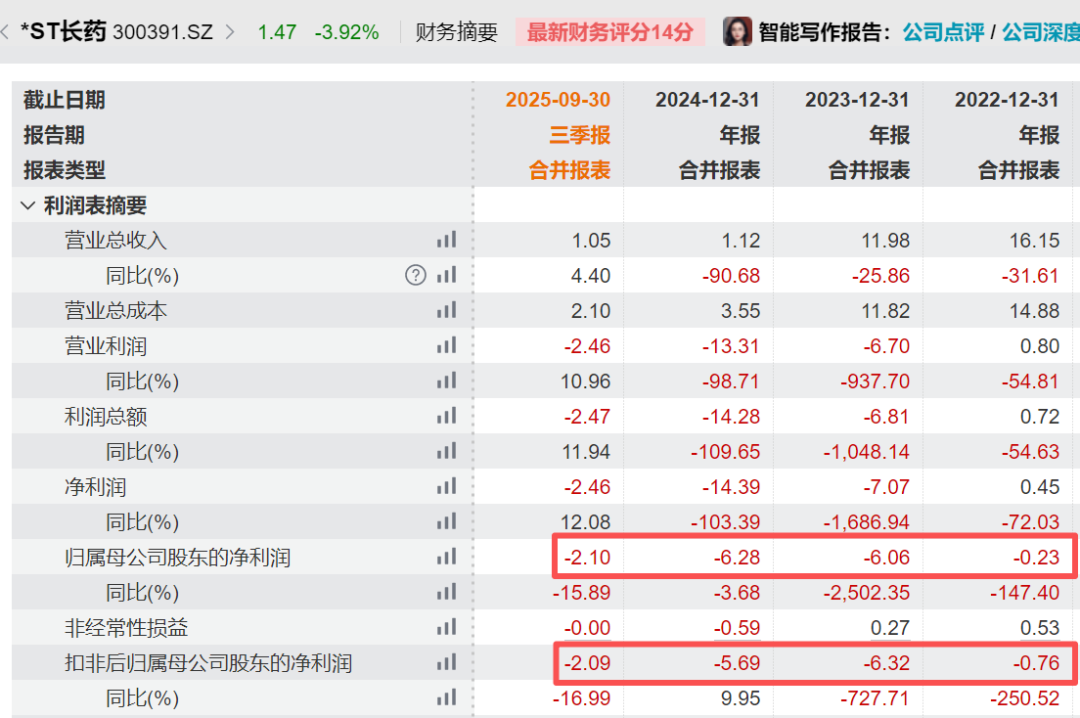 近年来,*ST长药业绩持续亏损。2025年前三季度,*ST长药归母净利润为-2.1亿元,同比下降15.89%。