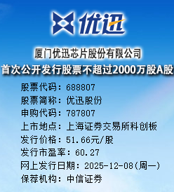 中国上市公司网讯12月8日,厦门优迅芯片股份有限公司(以下简称“优迅股份”或公司)申购。公司的股票简称为“优迅股份”,扩位简称为“优迅芯片股份”,股票代码为“688807”,该代码同时用于本次发行的初步询价及网下申购。本次发行网上申购代码为“787807”。优迅股份本次发行价格为51.66元/股,发行市盈率为60.27倍。