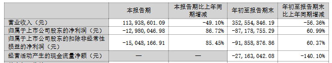 2025年1-9月,公司实现营业收入35,255.48万元,同比下降56.36%;归属于上市公司股东的净利润为-8,717.88万元,上年同期为-22,346.90万元;归属于上市公司股东的扣除非经常性损益的净利润为-9,185.89万元,上年同期为-23,180.84万元;经营活动产生的现金流量净额为-2,716.30万元,上年同期为6,773.01万元。