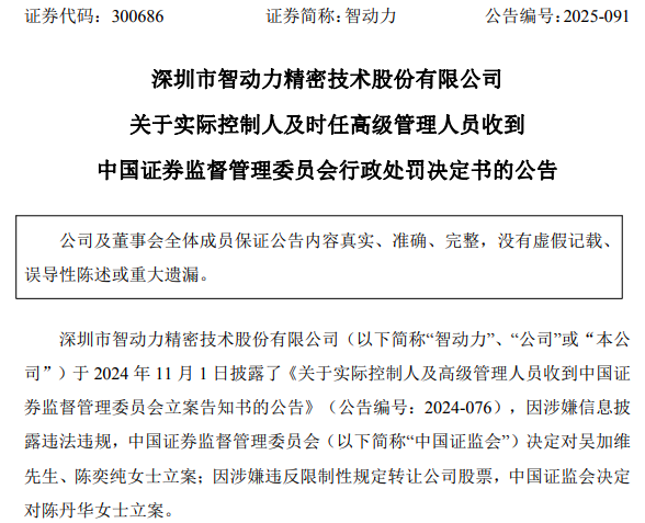 12月26日,智动力(300686)连收两重监管“敲打”:实控人夫妇因未及时披露股份转让补充协议领百万元罚单,副总经理违规减持遭警告罚款。