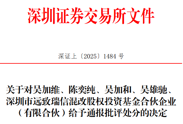 同日,深交所发布文件,对公司实际控制人、时任董事长吴加维,实际控制人、时任董事陈奕纯,实际控制人的一致行动人吴加和、吴雄驰,以及公司原持股5%以上股东深圳市远致瑞信混改股权投资基金合伙企业(有限合伙)给予通报批评处分。