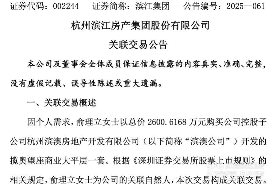 12月26日,滨江集团(002244)(002244.SZ)公告,因个人需求,公司董事长戚金兴之配偶俞理立以总价2600.6168万元,购入集团控股子公司滨澳公司开发的揽奥望座商业大平层一套,构成关联交易。