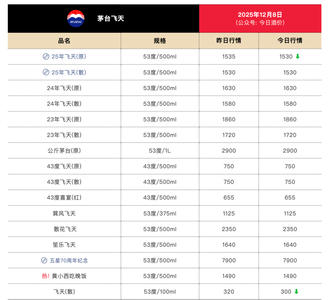 今年以来,茅台价格整体呈现下跌趋势。2025年款53度500ml飞天茅台原箱相继失守2000元、1900元、1800元、1700元、1600元关口。12月8日,该系列产品较前一日下跌5元,报1530元/瓶。