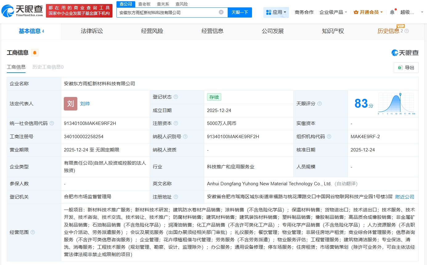 每经AI快讯,天眼查工商信息显示,近日,安徽东方雨虹(002271)新材料科技有限公司成立,法定代表人为刘帅,注册资本5000万元人民币,经营范围包括新材料技术推广服务、新材料技术研发、建筑防水卷材产品销售、防腐材料销售、建筑材料销售等。股东信息显示,该公司由上海东方雨虹防水技术有限责任公司全资持股。