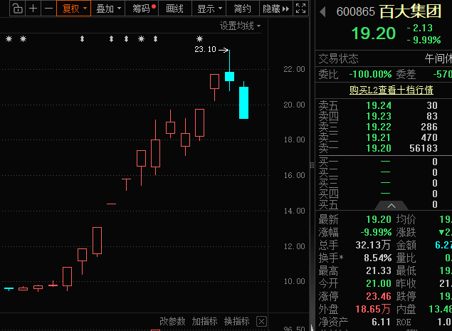 12月29日早盘,多只热门股开盘后股价跳水。百大集团(600865)(600865)开盘下跌1.55%,开盘后2分钟股价跌至9%以上,上午收盘时股价跌停。该股于12月26日盘中创年内高点,12月以来最大涨幅一度达到140%以上。