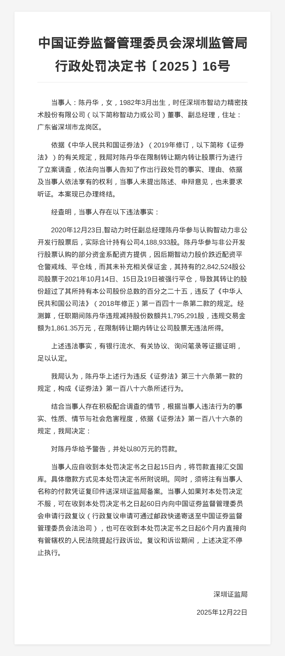 蓝鲸新闻12月29日讯,近日,深圳证监局发布了一则行政处罚决定书,剑指深圳市智动力(300686)精密技术股份有限公司董事、副总经理陈丹华。