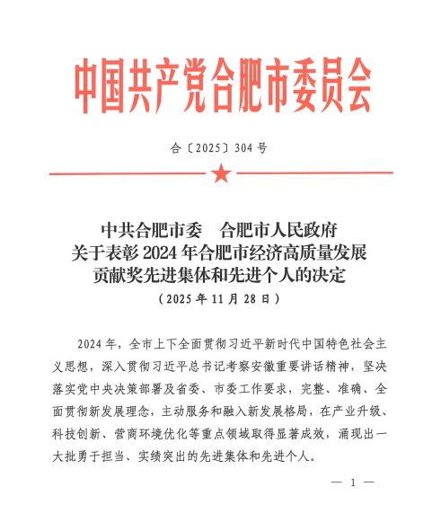 安利股份获“合肥市经济高质量发展贡献奖先进集体”
