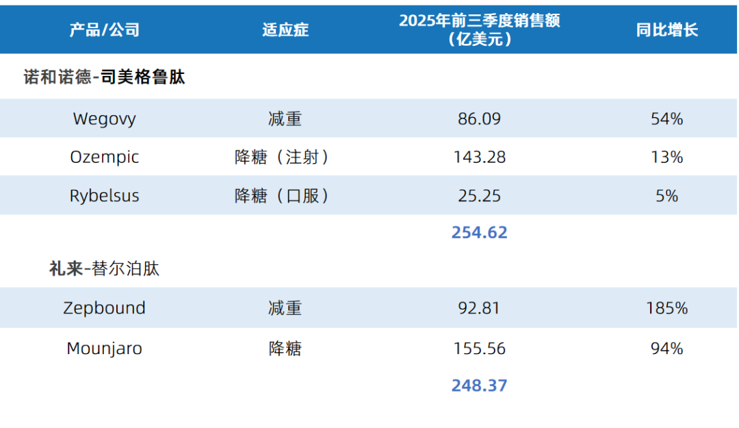 而当单靶点司美格鲁肽坐稳"网红药" 宝座之际,双靶点激动剂替尔泊肽横空出世,直接开启了"双引擎"治疗的新时代。2025年前三季度全球GLP-1市场呈现“双雄争霸”格局。司美格鲁肽以 254.62 亿美元的销售额暂列第一,替尔泊肽以 248.37 亿美元紧随其后,两者差距仅6.25亿美元,且均远超排名第三的默沙东K药(233.03亿美元)。其中替尔泊肽系列增速更为迅猛,尤其是减重版 Zepbound同比增长超180%,替尔泊肽凭借创新机制与卓越疗效,正在重塑肥胖与糖尿病治疗的格局。