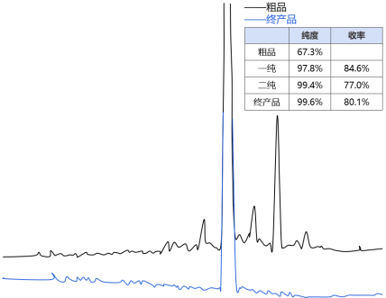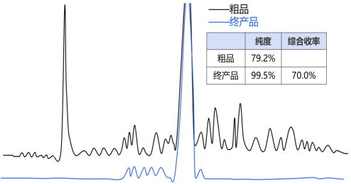 案例总结:针对全合成的替尔泊肽,采用两步UniSil Revo 10-120 C18进行纯化,通过 HPLC对纯化前后样品进行分析。结果显示,粗品纯度仅为79.2%,经过两步反相纯化后样品纯度得到突破性提升,最终达到99.5%,且单杂<0.1%,关键杂质得到有效去除,满足质控标准。同时,综合收率达70.0%。