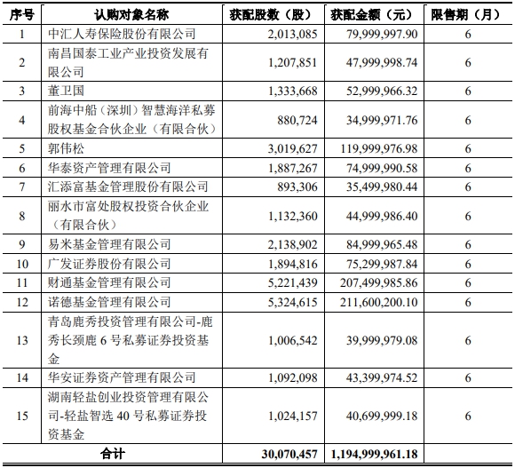 据公开资料显示,兆龙互连本次发行对象最终确定为15家。本次发行完成后,发行对象认购的股份自发行结束之日起6个月内不得转让,自2025年12月31日(上市首日)起开始计算。公司本次发行募集资金总额1,194,999,961.18元,募集资金净额为1,184,817,886.00元。