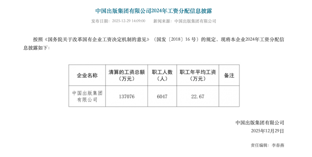 同时,中国出版集团还对2024年工资分配信息进行了披露,职工人数为6047人,职工年平均工资为22.67万元。