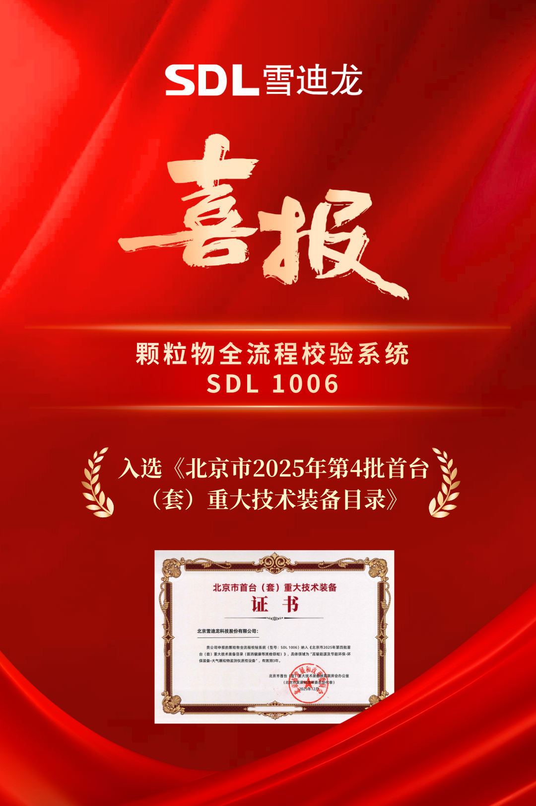 近日,雪迪龙(002658)自主研发的“颗粒物全流程校验系统(SDL1006)”,成功入选北京市发展和改革委员会《北京市2025年第4批首台(套)重大技术装备目录》,技术创新能力与行业应用价值获权威认可。